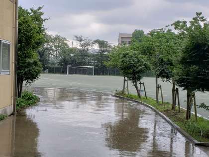一旦は雨か上がったため、生徒たちが校庭へ駆け出した途端、激しい雨脚となりました。残念ながら今日は校庭は使用できません。