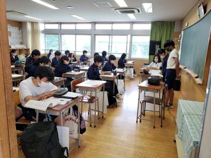 3年生、修学旅行コース決めの後は、いよいよ合唱コンクールに向けての選曲が始まりました。各教室からは合唱曲が流れ、生徒たちは静かに聴き入っています。やっぱり合唱曲が流れる学校はいいですね。
