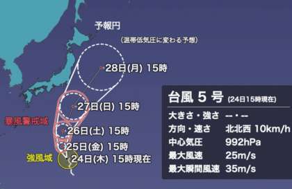 台風5号は発達しながら太平洋を北上中です。28日(月)から予定されている1年生移動教室への影響が心配されます。砧中学校では例年、台風情報は最接近の3日ほど前から情報収集に努め、当日朝の登校時での対応等について、早めにお知らせすることとしています。