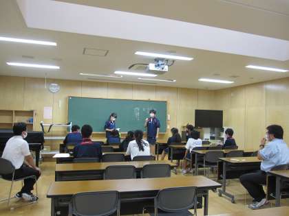 視聴覚室では週番引継ぎが行われています。3年生の今週の週番の生徒が司会をして進めています。(副校長)