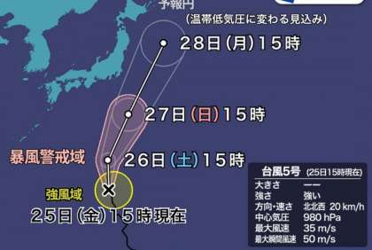 台風5号は現在発達しながら北上中です。関東甲信越への上陸のおそれは少ないと思われますが、28日(月)朝の段階で、ある程度の影響が予想されます。