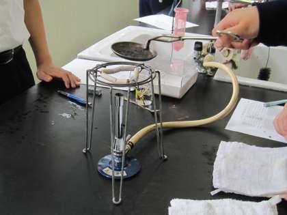 銅の重さの変化を調べるため、慎重な作業を行っています。ガスバーナーの炎の調節も手馴れていました。(副校長)