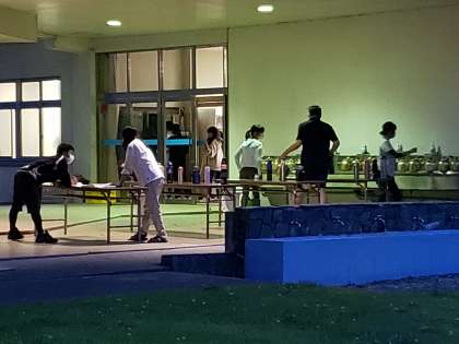 夕食が終わり、入浴までのホッと一息の時間です。各部屋で思い思いの時間を過ごしています。その間、教職員は生徒たちの水筒に新しいお茶の詰め替え作業をしています。