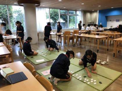 日本文化部では本日ランチルームで、7/13の3年生最後の百人一首大会に向けて練習をしました。I組百人一首部も一緒に参加です。読み手はタブレットでYouTubeを使いました。全て生徒の意見やアイディアで行われています。