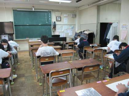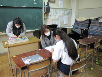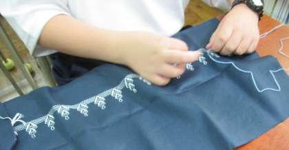 2年生は紺色の布に刺繍している生徒もいます。色の濃い布の方が布目が見えにくいので難しいようですが、素敵な作品になりそうですね。(副校長)