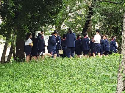 砧中は全国的にも珍しい学校敷地内に「古墳」がある学校です。社会科の授業ではそのメリットを活用しようと、古墳を実体験するフィールドワーク授業を独自に取り入れています。砧中の古墳は「円墳」です。単に土が盛り上がっているとしか見えない地形ですが、古墳時代にはかつてここに集落があったことが実感できます。崖のある地形と合わせて、遠い過去へと想像力がタイムスリップしていきます。