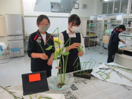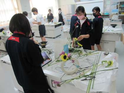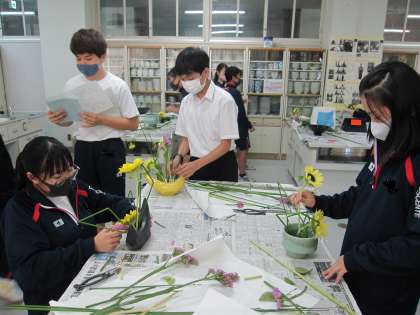 日本文化部、今日は2,3年生がお花を生けました。部員のご家族の方から寄贈していただいた花器も初登場し、華やかになりました。顧問がロイロノートで送った参考作品の写真を見たり、ネット検索した作品を参考にしたりする生徒もいました。一人一人の個性あふれる作品となりました。引退を来週にひかえている3年生にとって最後の華道の活動です。土曜日の11時過ぎまで視聴覚室前に展示していますのでよろしかったらご鑑賞ください。