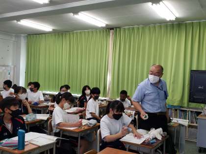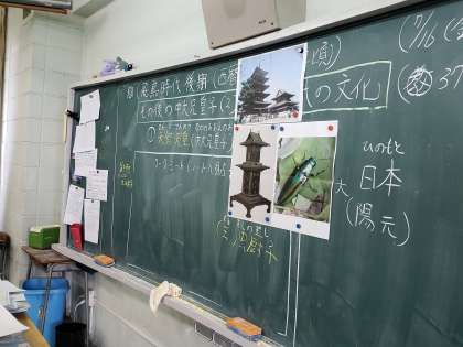 教員が取り出したのは玉虫の標本。虫の苦手な生徒は見なくていいよ、と言いながら標本を持って教室を巡りました。「怖い」という生徒もいれば、積極的に触れてみようとする生徒も。ある生徒は思わず「きれい」と声を上げました。そうです。虫の羽の美しさ、これが装飾に使われた理由ですね。