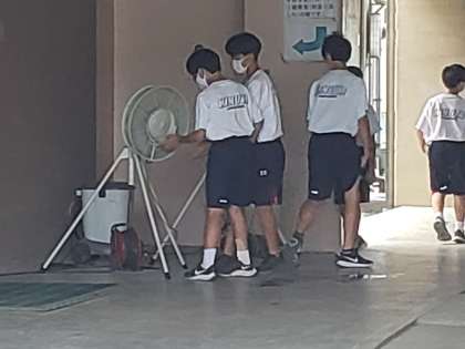 もちろんミスト発生器もフル稼働です。教室に戻る前の生徒が心地よさそうにミストを浴びていました。【写真下段】