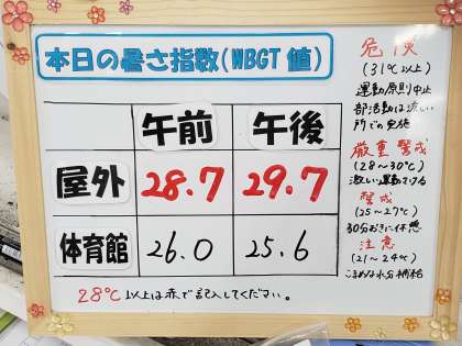 屋内の活動は、アリーナは冷房が昨年度から入っています。それでも決して安心することなく、指数チェックを行ってまいります。また水分補給については、顧問や先輩の許可制は廃止しています。各自が自由に給水できるよう全部活動で確認しています。