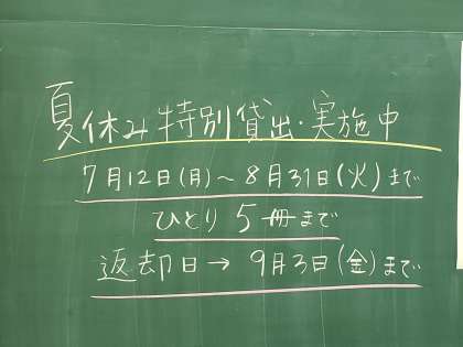 夏休み中も図書室は開館しています。部活動前後の時間や面談までの待ち時間としてもご利用いただけます。本を借りるだけでなく、自習室としても利用してくださいね。