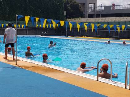 I組水泳指導も残すところ今日と明日。今日も午前中から生徒たちは水泳を楽しんでいました。少しずつ距離も伸びてきたようです。それを実感できるからこそ更なる意欲につながっていきますね。もうビート板なくても大丈夫という生徒もいました。先生も一緒にプールに入り、安全面には最大限配慮しています。