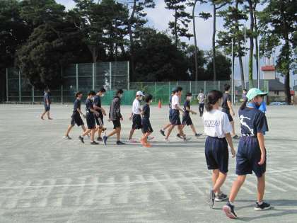 陸上部は午前組と午後組に分かれて活動しています。午前組は長距離チームです。校庭の周回コースを作っていました。
