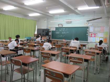 午前中、1年生の数学の補習を行っています。正負の数の計算の基本事項を確認しています。自分では気づかなかった間違いを修正することができ、2学期の学習に役立ちます。数学の宿題で分からないところがある人は明日も9時から12時までやっていますので来てください。(山地)