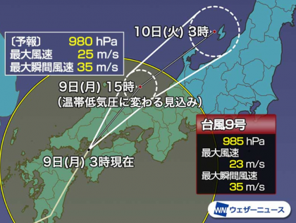 台風9号は、9日(月)5時すぎに広島県呉市付近に上陸しました。今後温帯低気圧に変わる見込みです。