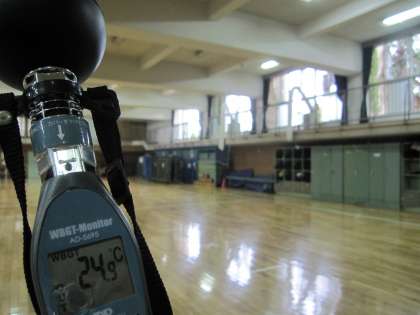 今日は、体育館と格技室での部活動が予定されています。顧問は早めに出勤し、体育館、格技室の換気やエアコン、スポットクーラー、大型扇風機の準備をしています。現在の熱中症指数は24度台です。油断せずにこまめな水分補給、休憩をとりながら活動してまいります。