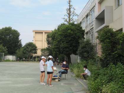 今日は男女テニス部の新人大会が予定されており、男女それぞれ8組のダブルスが出場します。砧中学校は女子の会場になっています。