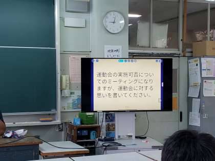 体育委員・学級委員の生徒たちと学校と自宅を繋いでのオンラインミーティングが行われました。議題は9月の運動会についてです。生徒たちからは「やりたい」という思いや、練習が十分できない中での開催は難しいなどの様々な意見が出されました。意見を言いやすいように、ロイロノートで自分の考えを送ってもらいました。この議論を踏まえて明日には全校生徒に運動会の方向性を説明いたします。