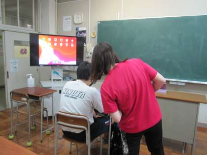 うまく接続できない場合には、教員が一人一人にアドバイスをしています。多くの場合、マイクロソフトのアップデートが完了していないことが原因のようです。生徒の皆さんには今日帰宅したらアップデートをするように伝えています。(副校長)