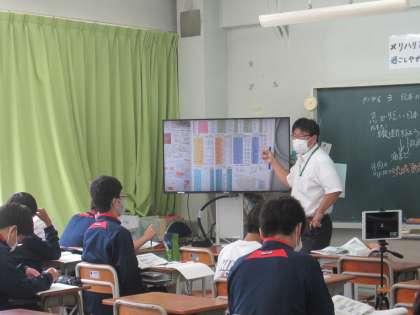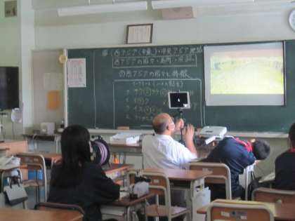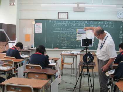 自宅から視聴している生徒のためにタブレットの向きを調整しています。時にはテレビ画面を映したり、教科書を映したり、映像を映したりしています。アナログなやり方かもしてませんが、自宅の皆さんにとっては教室にいる時と似たような感覚になれるかもしれません。(副校長)