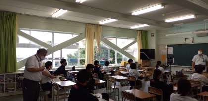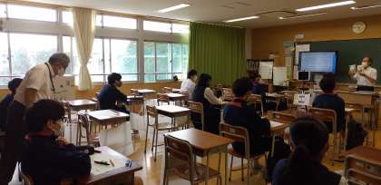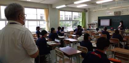 区教委の指導力向上サポート室の先生が分散登校の様子を視察されました。砧中の対面授業を大切にしつつ、オンライン授業も併用している取組の成果と課題を伝え、助言をいただきました。(副校長)