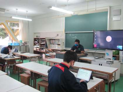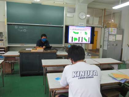 I組の社会科の授業では連合移動教室と関連した地理の授業を行っていました。Teamsで家庭から参加している生徒も発言したり質問したりして教室とつながっていました。また、社会科が得意な生徒が先生役となり、他の生徒にアドバイスをしていました。