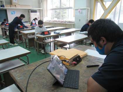 オンライン授業では、教員用のタブレットやパソコンが2台ある方が授業がやりやすいと授業者は話しています。(副校長)