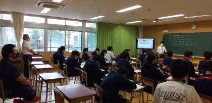 区教委の指導力向上サポート室の先生をお招きし、数学科教員の研究授業を3年生の発展クラスで行っています。自動車のスピードとブレーキ痕の長さの関係を2乗に比例する関数と捉えています。