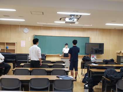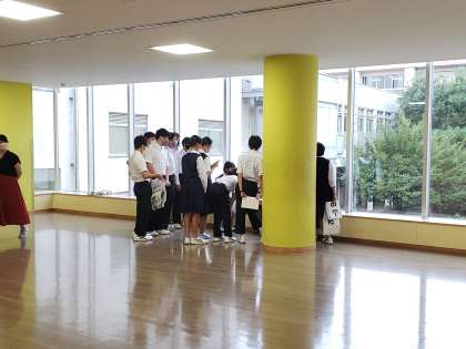 昨年度から立候補者や応援の演説は、事前に動画で撮影して、当日に各教室で視聴しています。立候補者はホールでこの後の撮影についての説明を受けていました。説明後は各自発声練習や原稿確認を行いました。