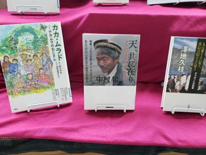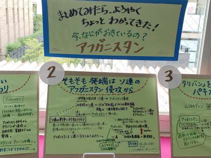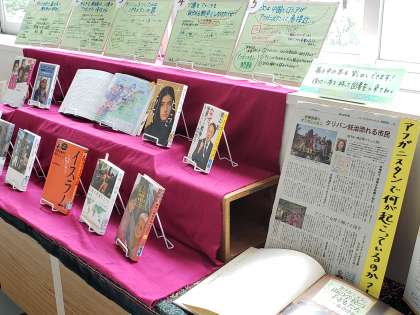 職員室前の出前図書館。新たな企画コーナーは「アフガニスタンについて考える」。ニュースなどで報道されるアフガニスタン問題。その歴史的背景から現在何が起きているのか、また各国との関係性などを学習できる企画となっています。