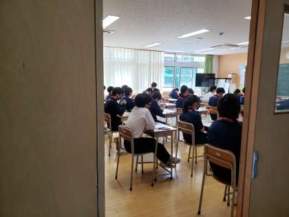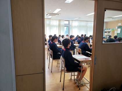問題と解答用紙が配布され、「始めてください」の合図を待っています。3年生はこれまで何度も経験してきた瞬間です。どんな問題が出るのか、不安で緊張する時間ですが、この時間こそ気持ちを落ち着け(今は深呼吸もできませんが)、これまで自分が取り組んできたことに自信を持って向き合う時間だと思います。3年生の待つ姿勢、とても素晴らしいと感じました。