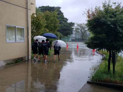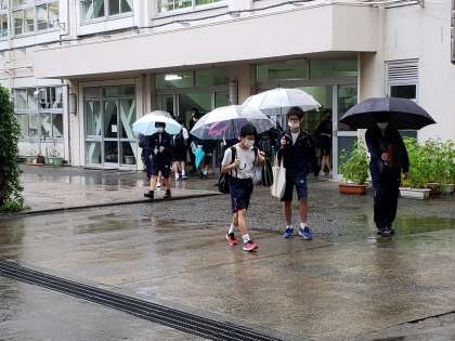 まだまだ雨が降り続いています。風は吹いていますが、それほど強くはありません。一日降り続きましたから、河川の周辺を通る際には気をつけて帰宅してくださいね。学区域内を教職員が巡回しています。
