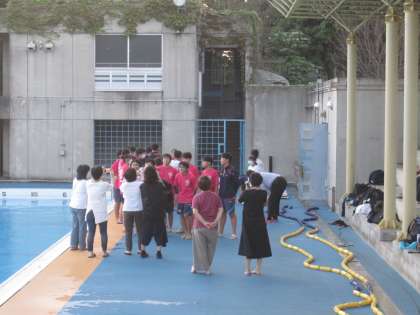 コーチは今の三年生が入学した時から、泳法から水泳への向き合い方まで教えて下さった生徒たちにとって正に恩師です。そのコーチも三年生と一緒に砧中水泳部からの卒業なので、三年生と記念写真を撮っています。
