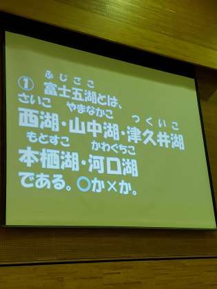 レクリエーションはクイズ大会。事前学習で勉強してきた内容が問われます。河口湖周辺に関する問題が中心ですね。さて、全問正解者が出るでしょうか?