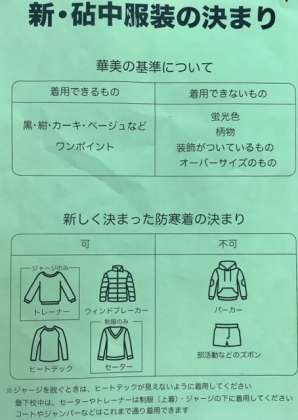 砧中の新しい服装のきまりにつきましては、今年度生徒会より提案されています(写真)。改めて生徒会から学活時などを利用して確認する予定です。
