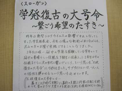 上の写真は本日生徒に配布した、学芸発表会実行委員が作成したおたよりです。先日の実行委員会で決定したスローガンが書かれています。生徒たちも教職員も思いは一つ。PTAの方々からも、当日の運営でご助力いただけると、大変ありがたいお申し出をいただいております。力を合わせ、行事の成功へ向けて努力してまいります。今後も新しい情報や進捗状況、生徒作品の展示予定などは、HPを通してお知らせします。よろしくお願いします。