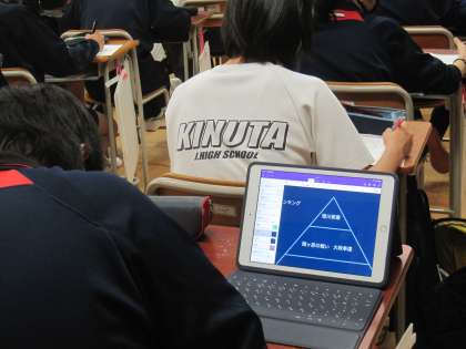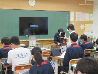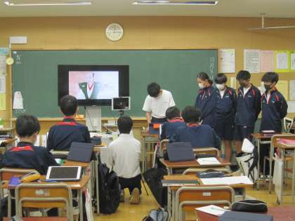 3年生 社会科 歴史の授業でグループごとに各時代について調べて発表していました。デジタルノートブックを使いこなし、手軽にプレゼン資料を作成していました。圧巻だったのは3年生のプレゼン力です。自分のことばで説得力のある説明。質問にも的確に答えていました。(副校長)
