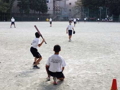 陽射しを浴びて、1年生はソフトボールに熱中していました。個々の技能向上とチームワークの両面が学習のねらいです。