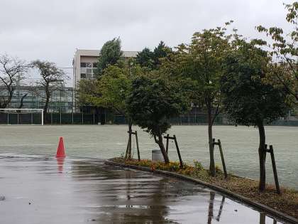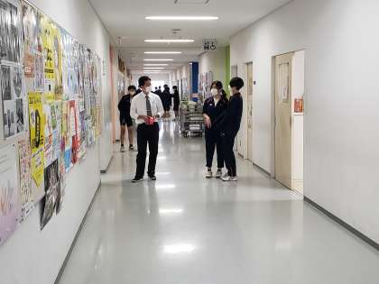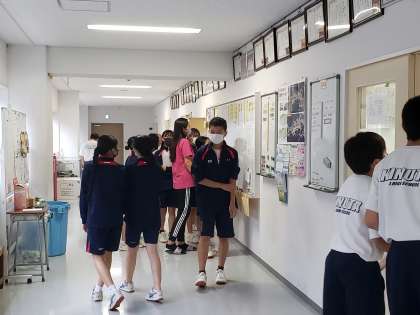 残念ながら今日の校庭は使用できません。生徒たちは校舎内で部活動ボードを確認したり、先生とお喋りしたりしながら過ごしています。校舎内が密状態にならないよう、窓は随時開放しています。思いっきり外で遊びたかった気持ちを抑えて、今日はコミュニケーション重視ですね。