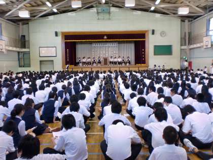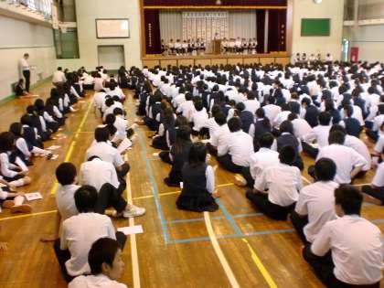 5校時に全校生徒が体育館に集まり、「生徒会役員立会演説会」を行いました。