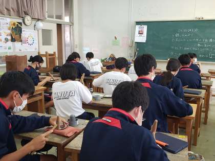 2年生美術は錫工芸に取り組んでいます。比較的柔らかい金属である錫。それを槌で叩いて叩いて加工していきます。どんな作品に仕上げたいのか、生徒たちは既に構想しているようです。槌の使い方が上手な生徒は美しい仕上がりとなっていました。集中力が求められますね。