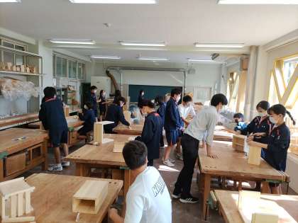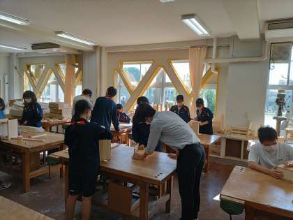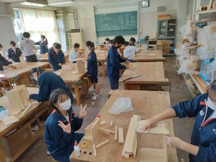 昼休み、木工室では2年生が木製棚の作業を進めています。生徒は、間に合わないので昼休みもやっていますと明るく答えてくれました。