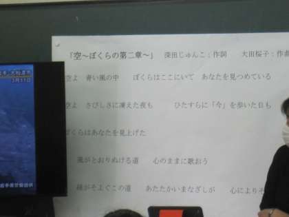 あるクラスの曲は東日本大震災で被害にあった学校の音楽教諭が生徒を勇気づけようと作詞家、作曲家に依頼して作られたものだそうです。曲の背景を知ることで、歌詞の意味を深く理解し、言葉に気持ちが込められていくことでしょう。(副校長)