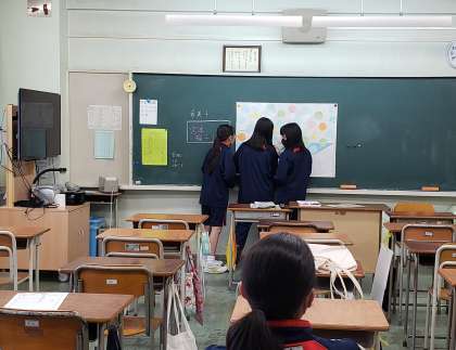 また別の学級では、学芸発表会へ向けて、生徒たちのメッセージを黒板に貼り出していました。生徒自身のアイデアで始めた取り組みだそうです。クラスの一体感を目指しています。