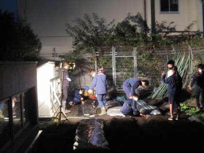 完全に日が落ちていますが屋上ではコーチの指導のもと、大根の種をまいています。急に寒くなってきましたが順調に育ってくれることを願っています。農業部のスポットライトが役立っています。