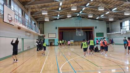 今日のポイントはバスケットボールのレイアップシュート。レイアップシュートとはゴール下でのシュート全般を指しますが、主には走りながら打つシュートのことです。試合では、特別ルールでレイアップシュートも3点です。生徒の技量や目的に応じた特別ルールは、生徒への意識付けにもなりますね。