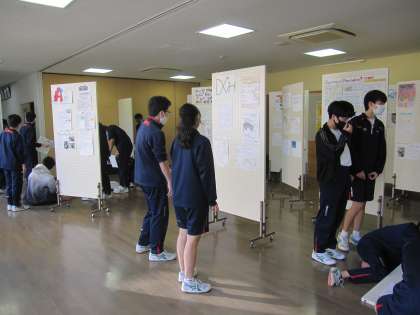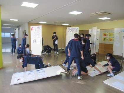 3年生の英語の展示作業を多目的ホールで行っています。