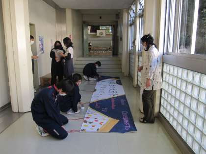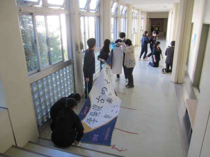 合唱している生徒たちの後ろに掲げます。学芸発表会実行委員スローガン係の力作もご覧ください。
