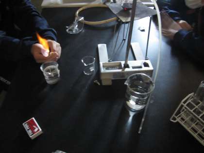 1年生 化学分野 ワインの蒸溜を行い取り出した液体がエタノールであることを火をつけて確認しました。
