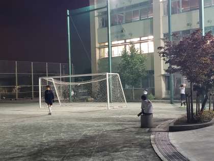 サッカーゴールの先では、3年生の教室に明かりが灯っていました。まだ面談が続いている学級があるようです。